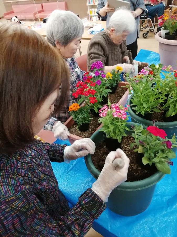 利用者様同士、花についての豆知識を共有しあうなど、にぎやかに花植え作業をすることができ、楽しんでいただけたのではないかと思います!