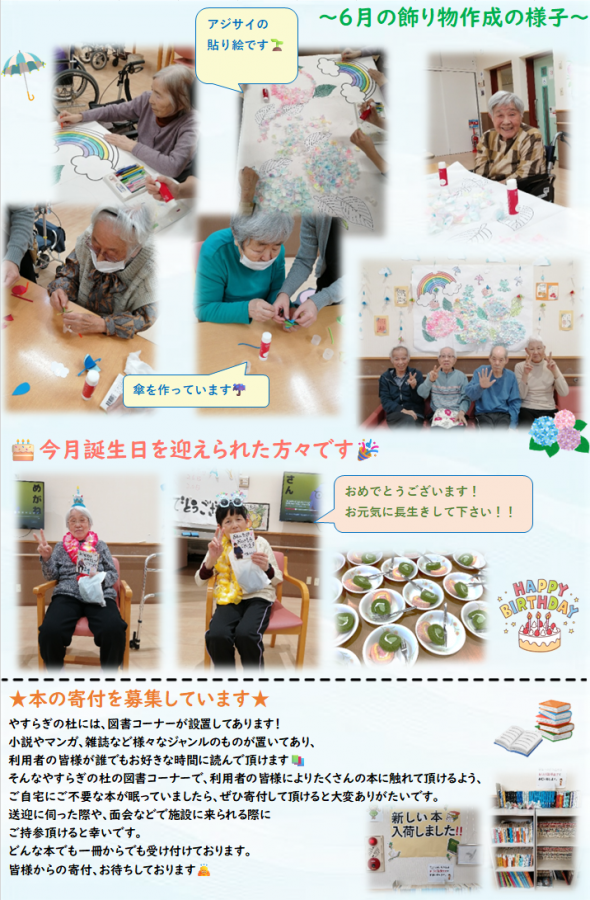 また、やすらぎの杜の図書コーナーへの本の寄付も、たよりにてお願いしています。