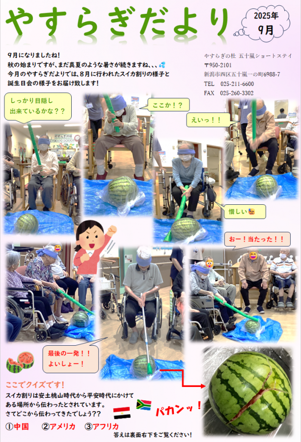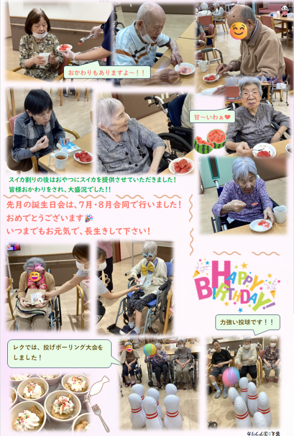 やすらぎだよりでは、先月行われたスイカ割りと誕生日会のご様子を載せています!