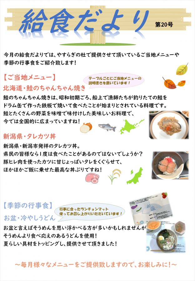 今月もやすらぎだより、給食だよりをご紹介させていただきます!
