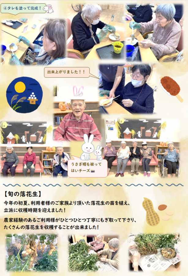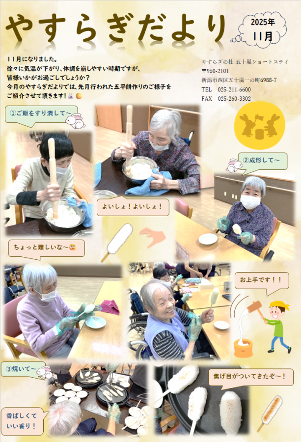 今月のやすらぎだよりには、手作り五平餅レクのご様子を載せさせて頂いております!