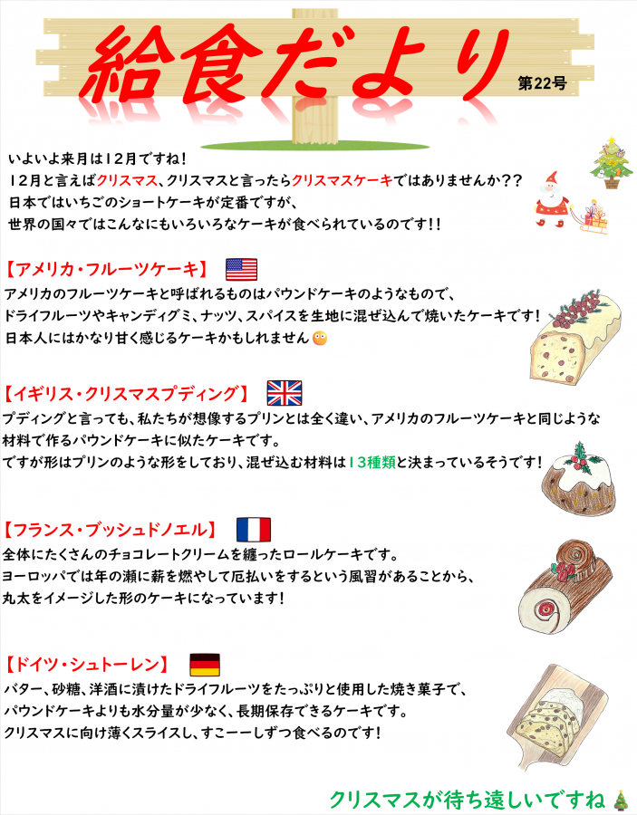 給食だよりは、少し早いですが、クリスマスケーキについてのご紹介になっております🎄