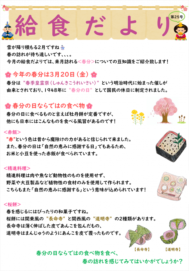 給食だよりでは、少し早いですが春分についての豆知識や食べ物について載せておりますので、