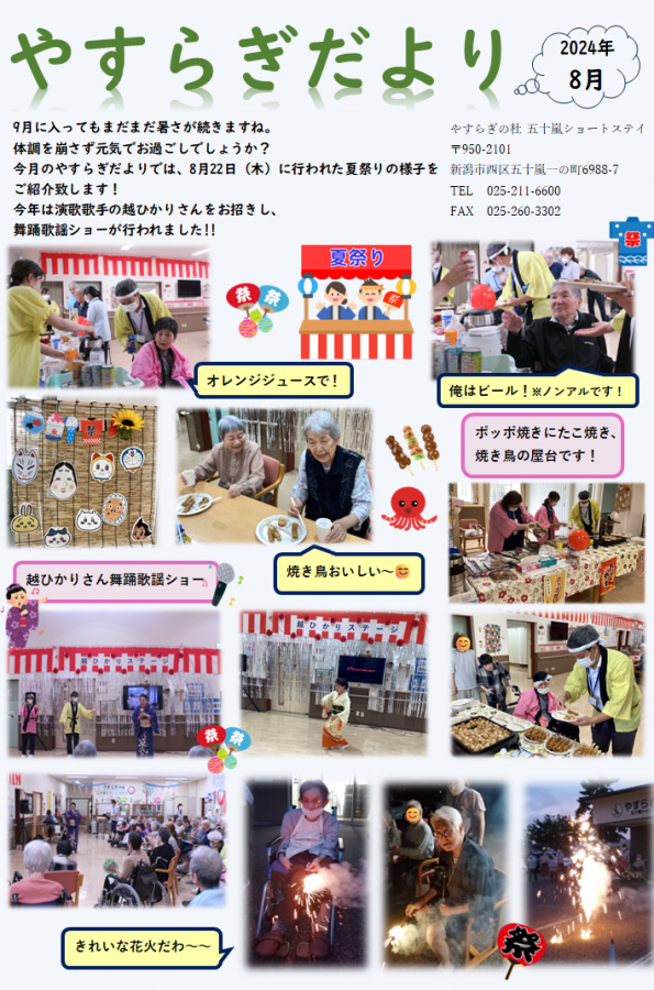 今月のやすらぎだよりでは、先日も投稿させていただきましたが、夏祭りの様子をご紹介しております!