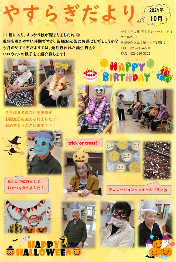 今月のやすらぎだよりでは、10月の誕生日会、そしてハロウィンの様子をご紹介させていただいております!