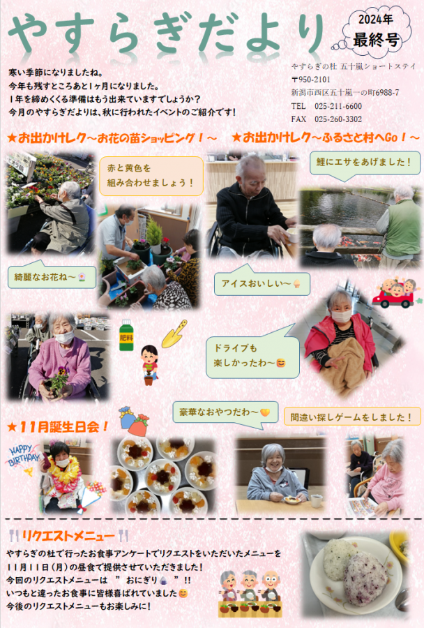 今回のやすらぎだよりでは、お出かけレクのご様子、11月誕生日会のご様子について