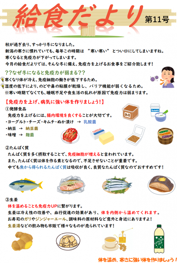 給食だよりでは、免疫力を上げる食べ物をご紹介しています!
